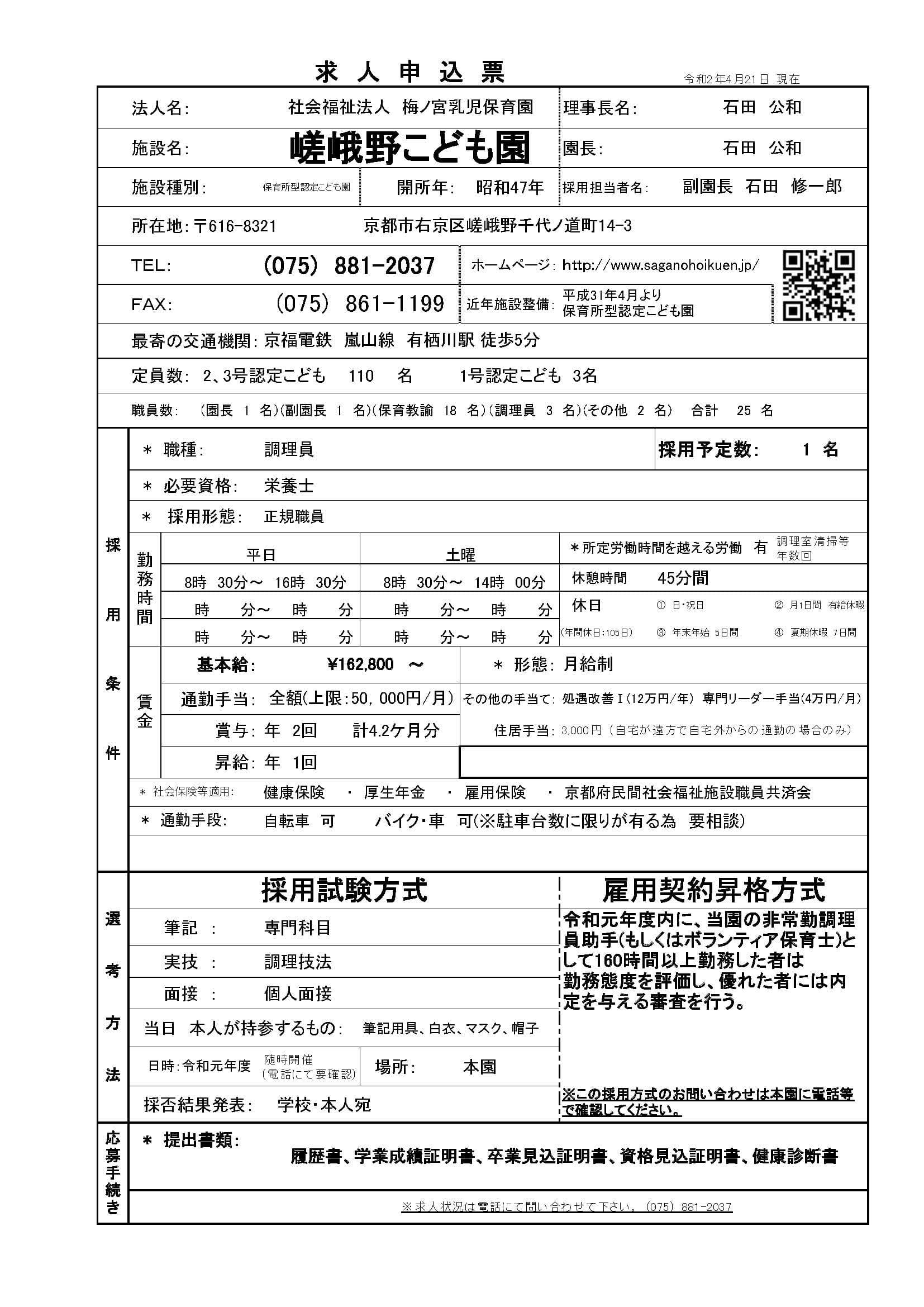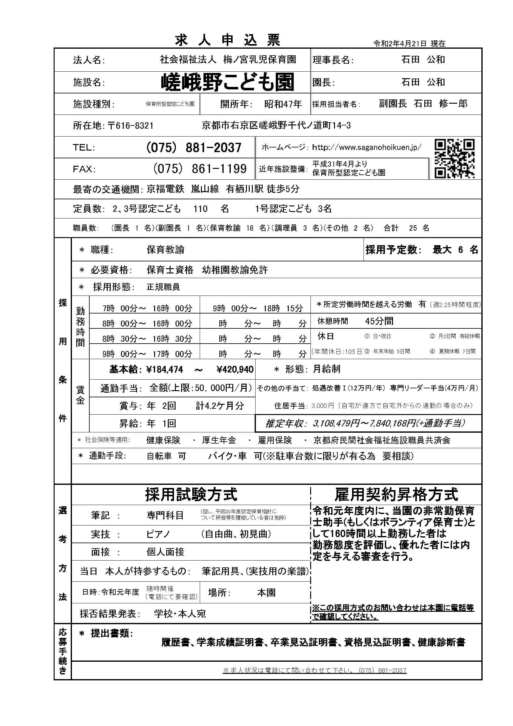 HOME | 求人情報 嵯峨野こども園で働いてみませんか?... 【正規雇用職員求人】・保育教諭 (要資格:保育士、幼稚園教諭)・調理員 (有資格者優遇:栄養士もしくは調理師) 【非常勤職員求人】・保育士助手 有資格者優遇 (時給920円~1,200円)・調理員 有資格者優遇 (時給920円~1,200円)詳しくは保育園までお問合せください。見学希望も受け付けています。☎ 075-881-2037電話受付 平日9:00~17:00 土曜日9:00~12:00 正規雇用求人票 保育士 調理員
